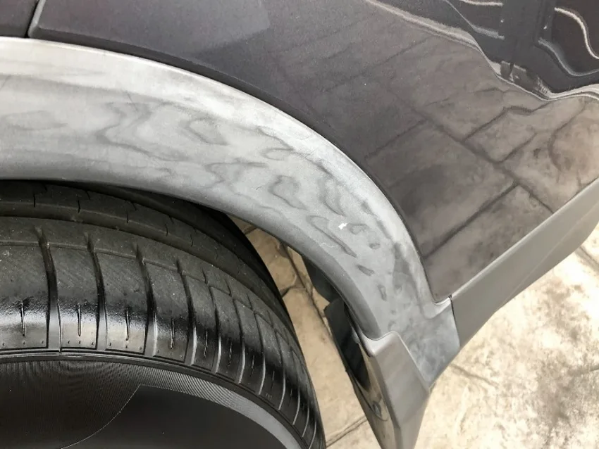 Nhựa nhám có cấu trúc bề mặt xốp nhẹ nhằm tạo độ chống trượt và giảm phản xạ ánh sáng. Khi xe bị ngâm nước lũ, bùn mịn và vi khuẩn bám sâu vào các lỗ nhỏ trên bề mặt nhựa, khiến màu sắc bị biến đổi. Sau khi khô, lớp cặn khoáng và hóa chất còn lại tạo thành vệt trắng loang lổ, làm mất màu nguyên bản.